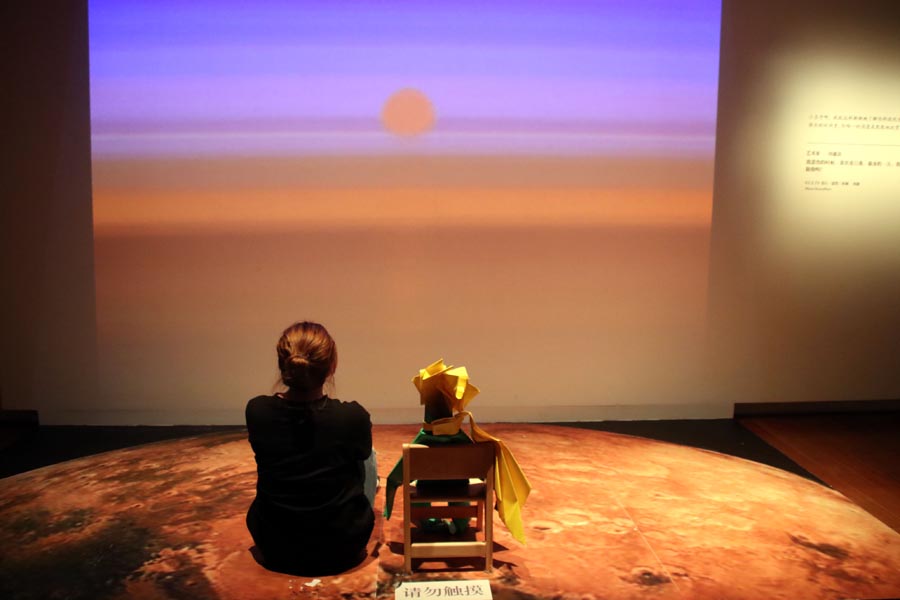 A visitor looks at the setting sun on screen at the exhibition Reviving the Inner Child in Suzhou, Jiangsu province, June 9, 2018. [Photo by Wang Jiankang/Asianewsphoto]