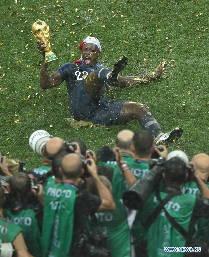 Benjamin Mendy of France celebrates after the 2018 FIFA World Cup final match between France and Croatia in Moscow, Russia, July 15, 2018. France defeated Croatia 4-2 and claimed the title. (Xinhua/Wu Zhuang)