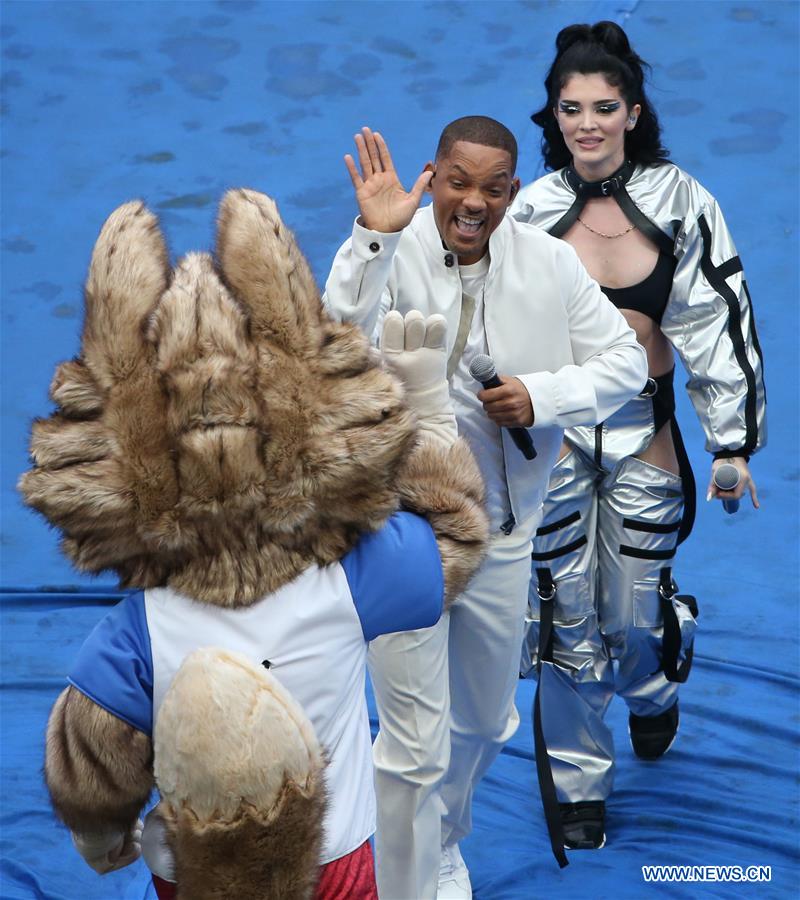 U.S. actor Will Smith (C) performs at the closing ceremony of the 2018 FIFA World Cup in Moscow, Russia, July 15, 2018. (Xinhua/Li Ming)