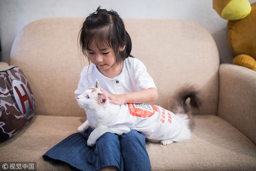 A little girl strokes a cat at the Cat Fairy cafe in Hangzhou. [Photo/VCG]