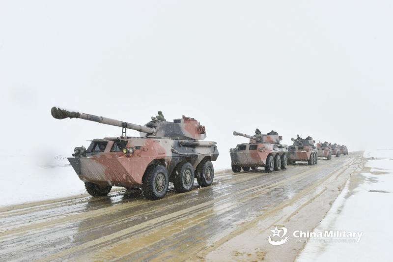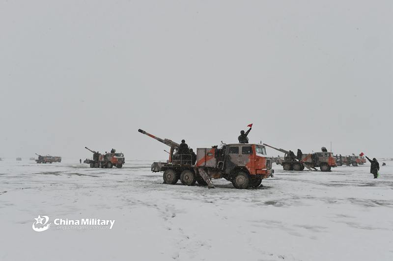Artillerymen assigned to an artillery battalion of a brigade under the PLA 76th Group Army operate PCL-09 122mm truck-mounted self-propelled howitzer systems to fire at mock targets during a live-fire training exercise in the heavy snow at an altitude of 4.000 meters in northwest China's Qinghai-Xizang Plateau on August 7, 2018. (eng.chinamil.com.cn/Photo by Wang Guangyao)