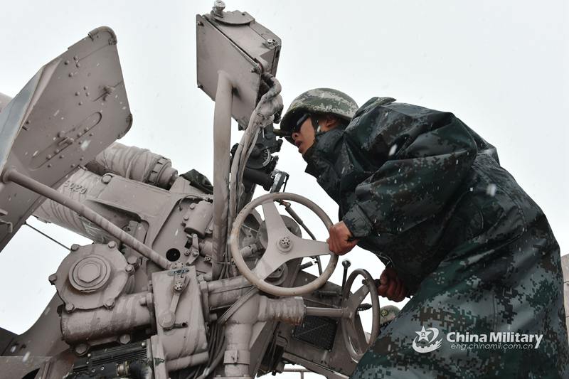An artilleryman assigned to an artillery battalion of a brigade under the PLA 76th Group Army prepares a PCL-09 122mm truck-mounted self-propelled howitzer system during a live-fire training exercise in the heavy snow at an altitude of 4.000 meters in northwest China's Qinghai-Xizang Plateau on August 7, 2018. (eng.chinamil.com.cn/Photo by Wang Guangyao)