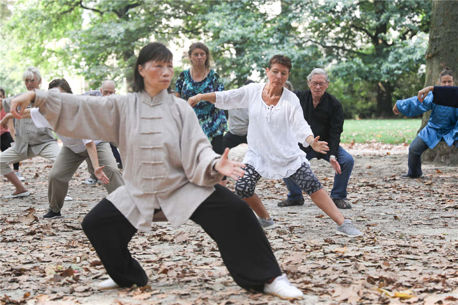 People learn tai chi at the Cinquantenaire park in Brussels, Belgium, Aug 21, 2018. Every Tuesday and Friday afternoon, free Chinese tai chi class is held here and it attracts many local residents in Brussels. [Photo/Xinhua]
