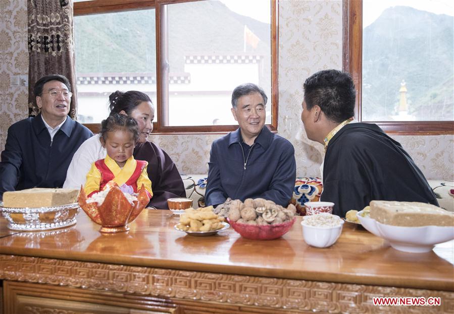 Wang Yang, a member of the Standing Committee of the Political Bureau of the Communist Party of China (CPC) Central Committee and chairman of the National Committee of the Chinese People's Political Consultative Conference (CPPCC), visits a Tibetan family in Qamdo, southwest China's Tibet Autonomous Region, Aug. 24, 2018. Wang made an inspection in Tibet recently. (Xinhua/Wang Ye)
