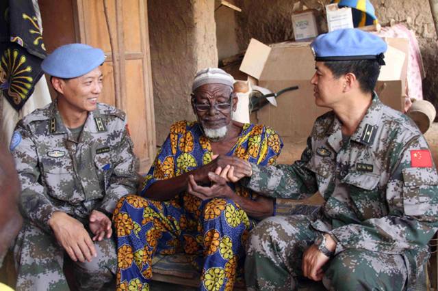 Chinese peacekeepers for the UN Mali Mission chat with an elder after bringing medicines to villagers in Gao, Mali on May 27, 2015. [Photo/Xinhua]