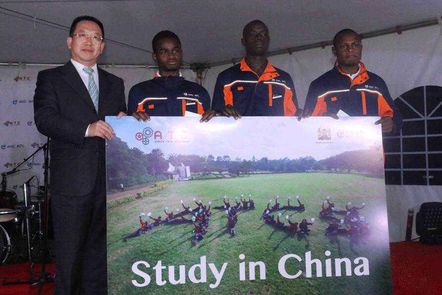 Guo Ce, the economic and commercial counsellor at the Chinese embassy in Kenya, hands over scholarships to the top three winners of the fifth AVIC Tech Challenge in Kenya. [Liu Hongjie/China Daily]