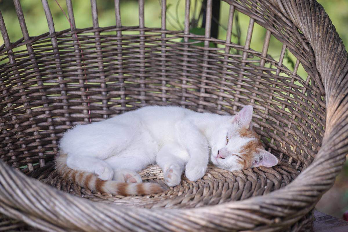 A cat sleeps in a basket provided by the cat lovers in the area. [Photo by Tang Tao for chinadaily.com.cn]