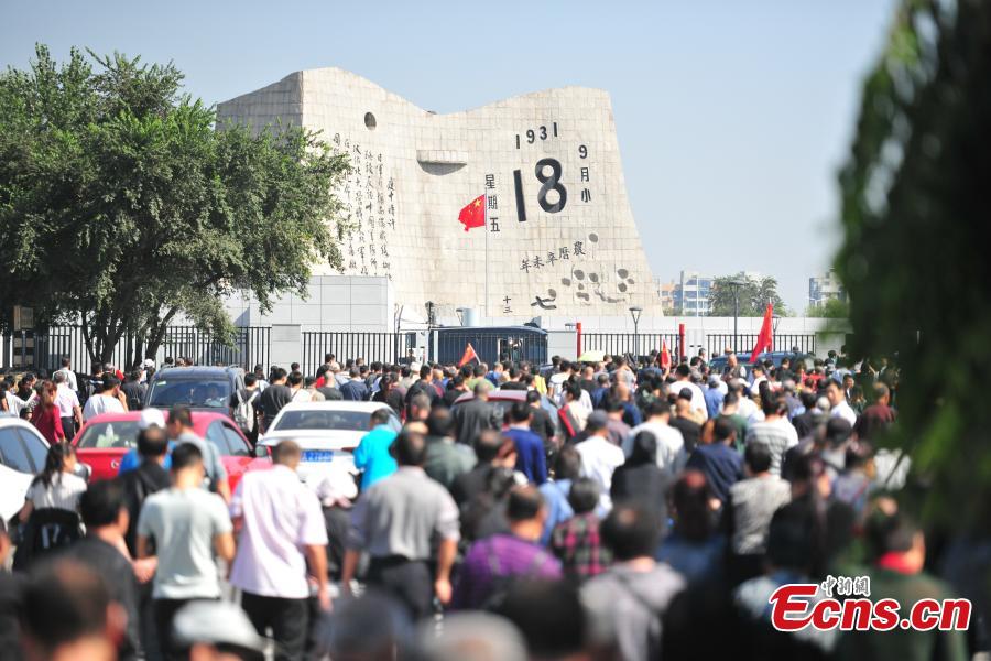 Visitors go to attend a ceremony to commemorate the 87th anniversary of the "Sept. 18 Incident", in Shenyang, Liaoning Province, Sept. 18, 2018. On September 18, 1931, the Japanese Kwantung Army stationed in northeast China destroyed a section of the railway near Liutiaohu and then falsely accused the Chinese military of causing the explosion. Using this as a pretext, the Japanese then bombarded Shenyang and began invasion of northeast China. (Photo: China News Service/Yu Haiyang)