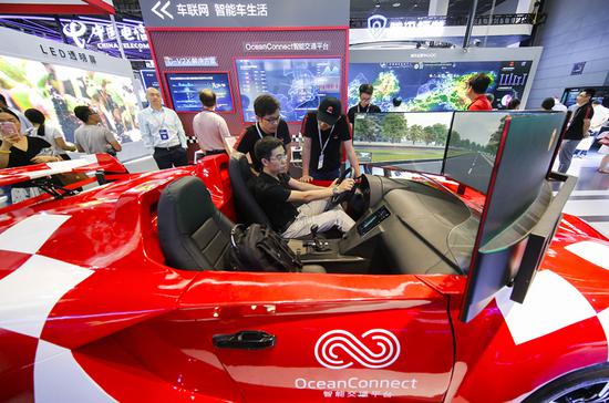 A futuristic concept car at the 2018 World Internet of Things Expo in Wuxi, Jiangsu province, last month is equipped with Internet of Vehicles technology, which collects and analyzes traffic and driving data. (CHENG JIABEI/FOR CHINA DAILY)