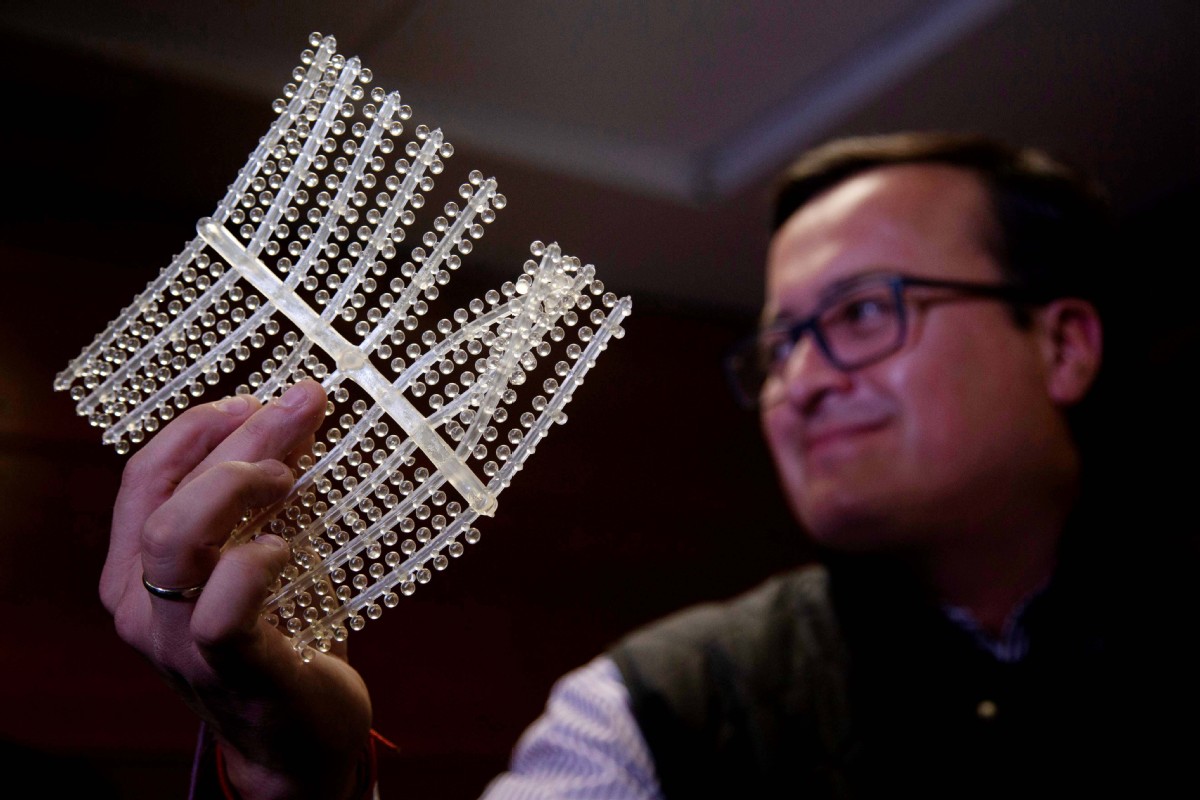Engineer Christian Olivares shows a sheet of PVA, which could help prevent ecological damage in the world's oceans. CLAUDIO REYES/FOR CHINA DAILY