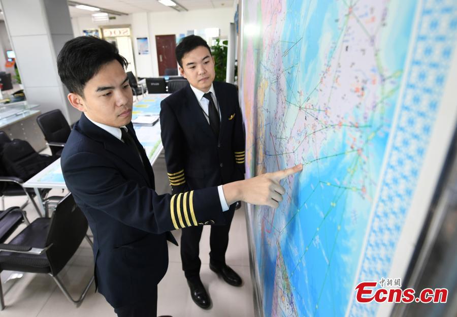 Twin brothers Liu Ke (L) and Liu Xin study a flight map on Oct. 16, 2018. The twin brothers, born in 1987, were from a young age both interested in becoming pilots. After graduating high school, they both went on to study at the Civil Aviation Flight University of China. Later, both became pilots for China Southern Airlines. (Photo: China News Service/Zhang Yao)