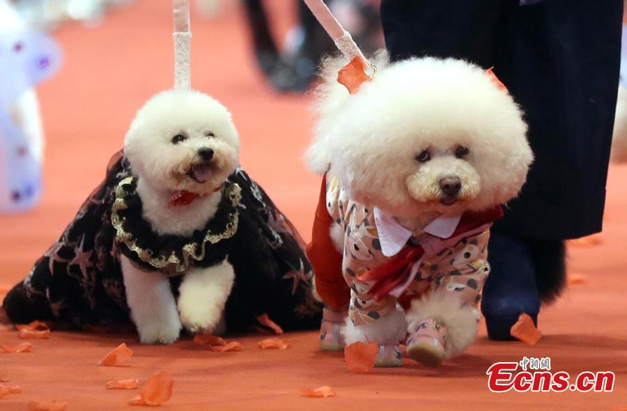 A "group wedding" is held for nearly 100 pet dogs of different breeds at the 2108 China (Nanjing) Pet Culture Festival in Nanjing, Jiangsu Province, Nov. 24, 2018. (Photo: China News Agency/Yang Bo)
