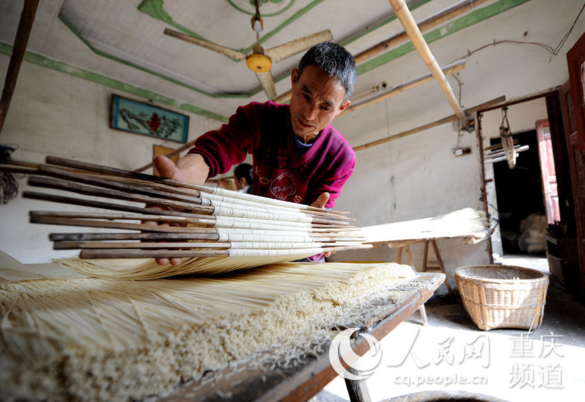 Photo taken on Nov. 25 shows Deng Kaiming’s grandson-in-law putting the dried noodles in order at the kitchen. (Photo/Zhou Bangjing from People’s Daily Online)