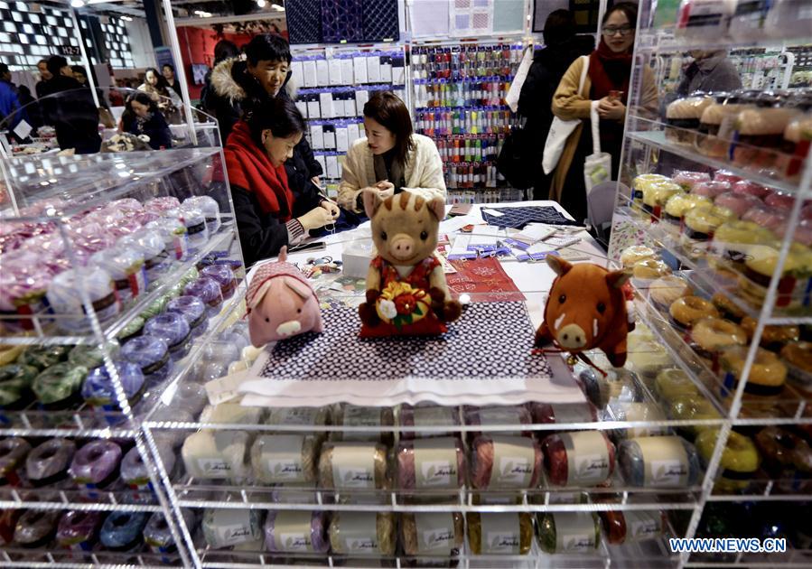 A visitor experiences weaving during the 4th Shanghai International Hobbycraft Expo in Shanghai, east China, Dec. 7, 2018. More than 300 exhibitors from home and abroad took part in the three-day expo, which opened here on Friday. (Xinhua/Liu Ying)