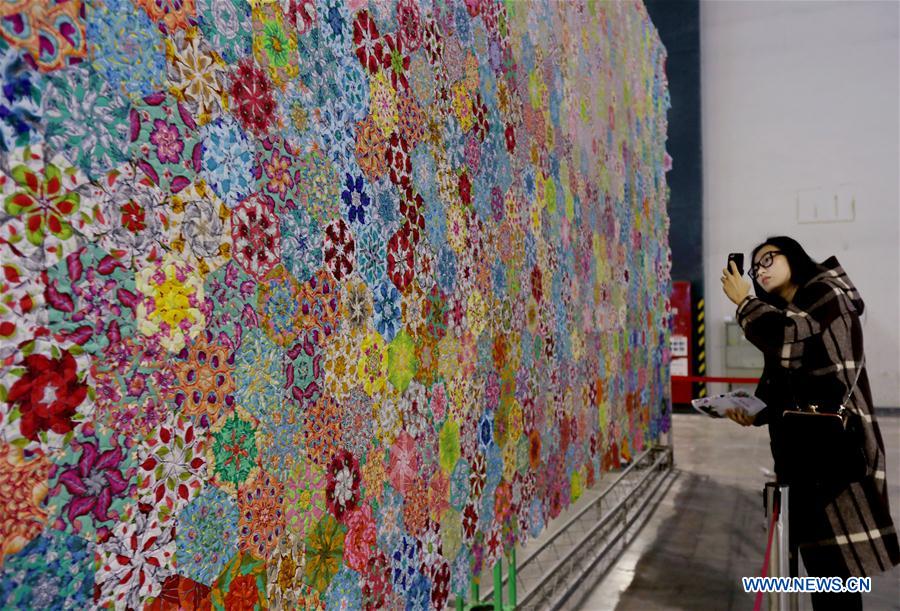 A visitor takes photos of a huge cloth artwork during the 4th Shanghai International Hobbycraft Expo in Shanghai, east China, Dec. 7, 2018. More than 300 exhibitors from home and abroad took part in the three-day expo, which opened here on Friday. (Xinhua/Liu Ying)