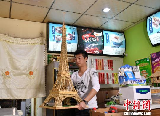 Xu displays his work – a model of Eiffel Tower made with bamboo sticks. (Photo/Chinanews.com)