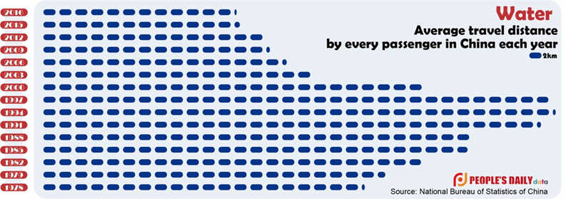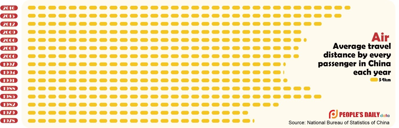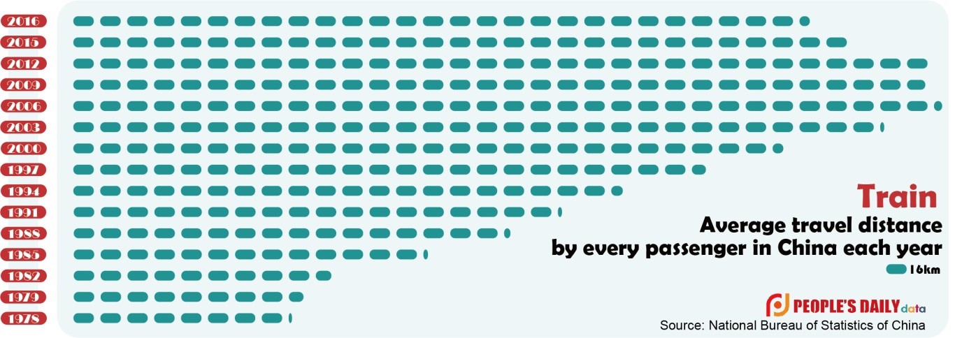 On average in 2016, every passenger in China traveled 164.5 kilometers, nearly the distance between Beijing and Tianjin. Back in 1978, when China started its reform and opening up policy, it was only 40 percent of that.