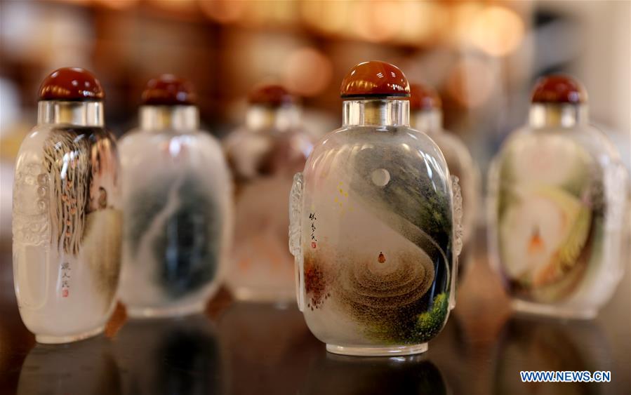 Photo taken on Dec. 28, 2018 shows inner painted snuff bottles created by teacher Yin Jianqing at Hebei College of Industry and Technology in Shijiazhuang, north China's Hebei Province, Dec. 28, 2018. The college takes intangible cultural heritages such as techniques of pyrograph and inner painting into school courses in recent years. (Xinhua/Liang Zidong)