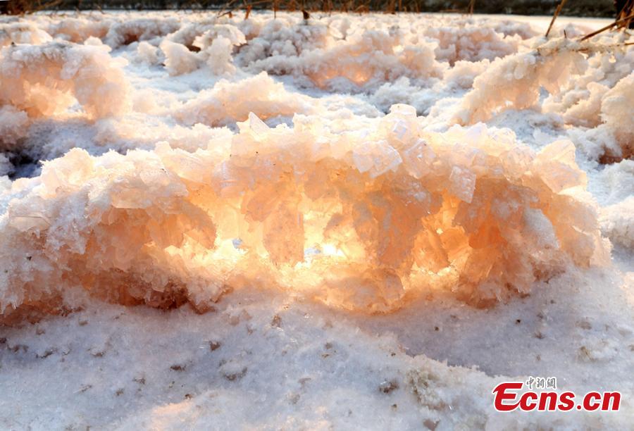 A view of the scenery of mirabilite rime on the Salt Lake in Yuncheng City, North China's Shanxi Province, Jan. 2, 2019. Mirabilite rime is formed when mirabilite crystalizes at low temperatures in the inland saltwater lake, formed about 500 million years ago and known as “China’s Dead Sea.” (Photo: China News Service/Jiang Hua)