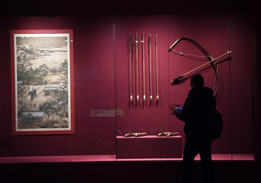 A tourist looks at exhibits displayed at the Palace Museum, also known as the Forbidden City in Beijing, capital of China, Jan. 7, 2019. In celebrating of the most magnificent of all traditional holidays, the Palace Museum presents exhibition of "Celebrating the Spring Festival in the Forbidden City" starting Jan. 7, 2019. Hundreds of exhibits will be displayed at the museum. (Xinhua/Jin Liangkuai)