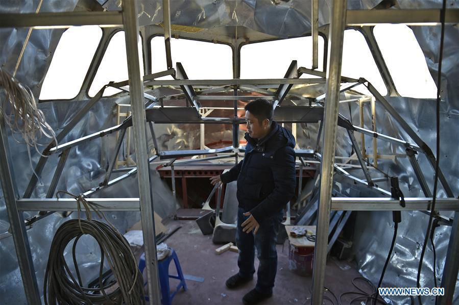 Zhu Yue explains the design of the pilot's cabin of his "plane" in Kaiyuan, northeast China's Liaoning Province, Jan. 8, 2019. Zhu has an interest in plane since childhood. He began to build a full-size plane model of the Airbus 320 with his team members in 2017. Now Zhu is about to finish the building of the model. He plans to make it an experiencing attraction combining themed restaurant, wedding photography studio and flight simulating program. (Xinhua/Yao Jianfeng)