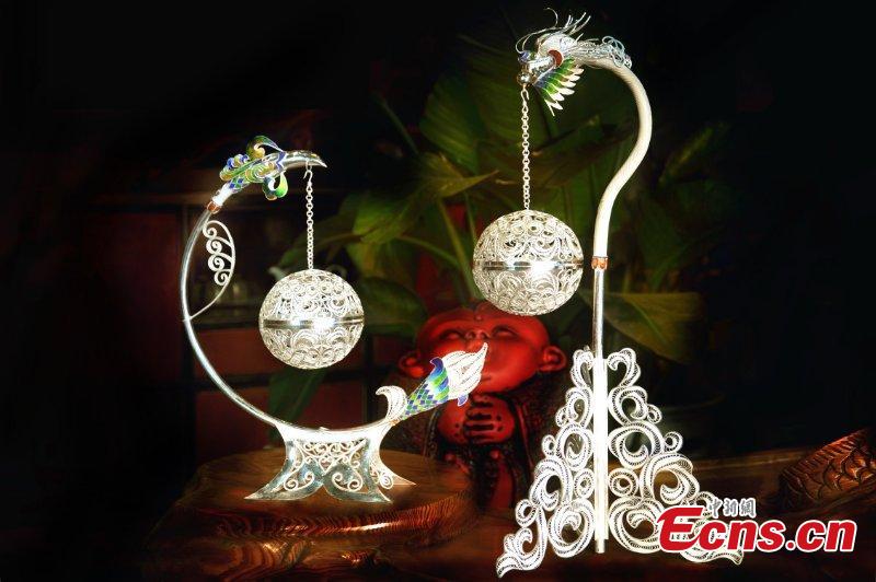 Crafts made using silver thread in Chengdu City, Southwest China's Sichuan Province. The craft dates back to the Song Dynasty (960-1279) and involves time-consuming, elaborate steps to pull a one-meter silver piece into a 1000-meter thin thread, which is then used to make all kinds of handmade works. In 2008, the craft was included as a national intangible cultural heritage. (Photo: China News Service/Zhong Xin)