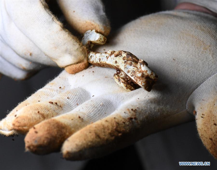 Photo taken on Jan. 28, 2018 shows a jade hook relic unearthed from the No. 5 tomb of the Marquis of Haihun site in Nanchang, east China's Jiangxi Province. The National Cultural Heritage Administration will work out a plan to better protect cultural relics and speed up the creation of a safety oversight platform in 2019. Stressing the importance of such protection, Liu Yuzhu, head of the administration, said lax enforcement is a prominent problem that endangers cultural relics, at a meeting attended by cultural heritage administrators nationwide. (Xinhua/Li He)