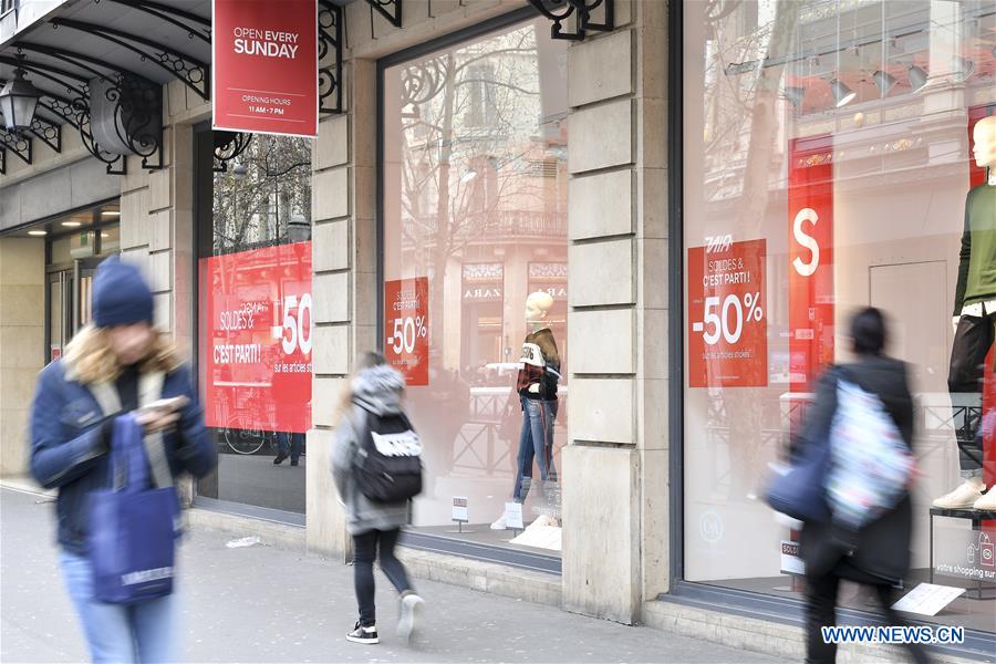 Pedestrians pass by a shop window in Paris, France, on Jan. 10, 2019. The traditional discount season kicked off on Wednesday and will last till Feb. 19. (Xinhua/Jack Chan)