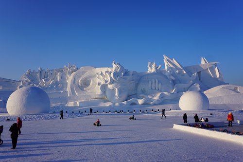 Much less crowed than Ice-Snow World, the Snow Sculpture Expo on Sun Island Park focuses on displaying snow sculptures. With the Spring Festival right around the corner, tourists can find sculptures depicting scenes from traditional Chinese myths and stories. Ice sculptures carved by both professionals and talented enthusiasts are also on display.