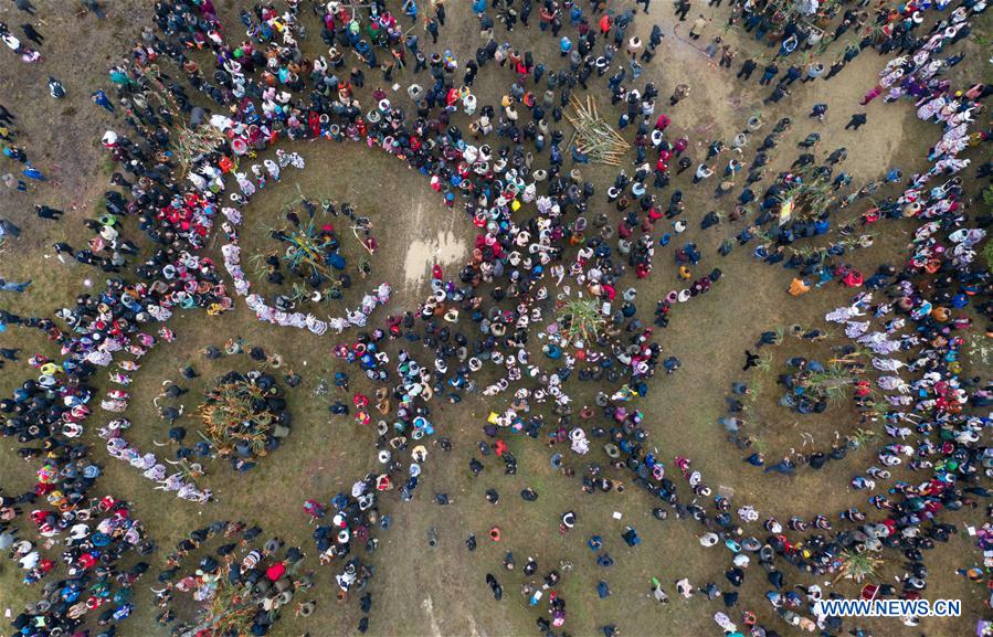 Aerial photo taken on Feb. 20, 2019 shows people taking part in the "pohui" festival in Xiangfen Township of Rongshui Miao Autonomous County, south China's Guangxi Zhuang Autonomous Region. Residents from nearby townships gathered on Wednesday to celebrate the traditional festival. (Xinhua/Zhang Ailin)