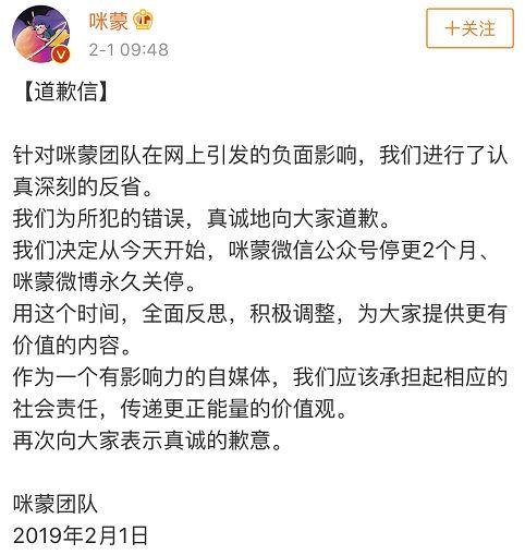 Ifeng.com announced the shutdown of Mimeng's accounts on the platforms as a result of "taking its responsibilities as the content regulator to crack down on fake information, pessimistic values, cheating for clicks and behavior that purposely splits society."
