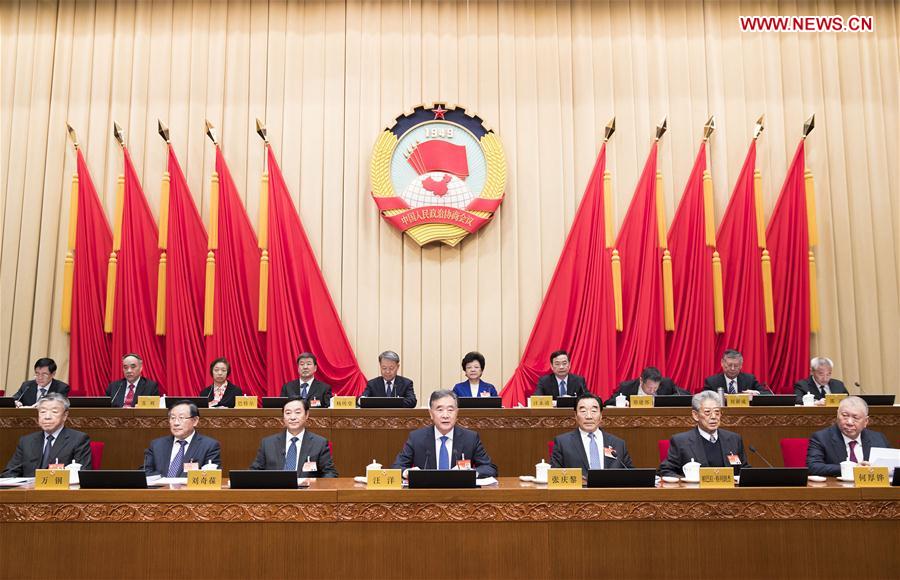 Wang Yang (C, front), chairman of the Chinese People's Political Consultative Conference (CPPCC) National Committee, presides over the closing meeting of the fifth session of the Standing Committee of the 13th CPPCC National Committee in Beijing, capital of China, March 1, 2019. (Xinhua/Huang Jingwen)