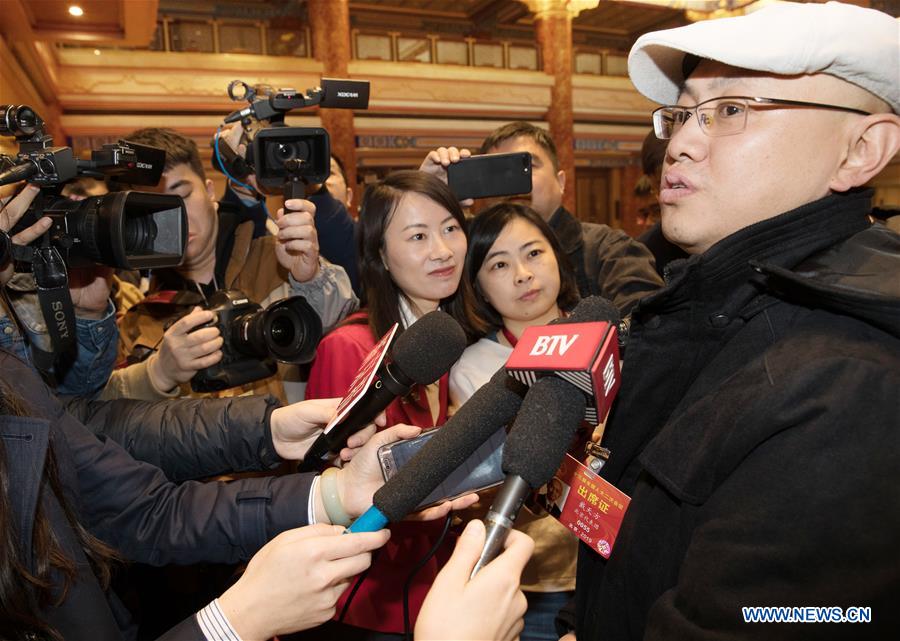 Dai Tianfang (1st R), a deputy to the 13th National People's Congress (NPC) from Beijing, receives an interview after registering at Beijing Conference Center in Beijing, capital of China, March 3, 2019. The second session of the 13th NPC will convene on March 5.(Xinhua/Jin Liwang)
