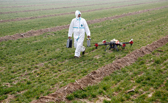 A technician operates a drone to carry out chemical weeding operations in a wheat field in Lixin village, Guandao town, Linwei district, Weinan city in northwest China's Shaanxi province, March 5, 2019. Photo by Cui Zhengbo from People’s Daily Online
