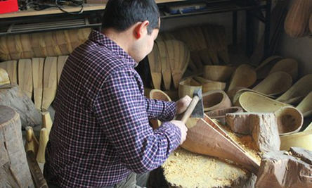 One of Aiyiti's apprentices uses a chisel to make a Dutar.( Photo from Global Times)