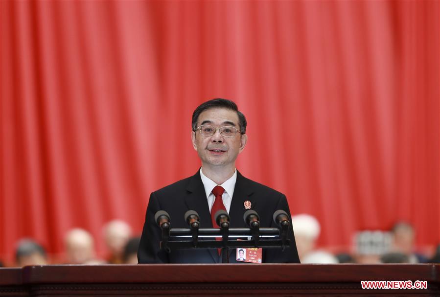 Chief Justice Zhou Qiang delivers a work report of the Supreme People's Court (SPC) at the third plenary meeting of the second session of the 13th National People's Congress (NPC) at the Great Hall of the People in Beijing, capital of China, March 12, 2019. (Xinhua/Pang Xinglei)