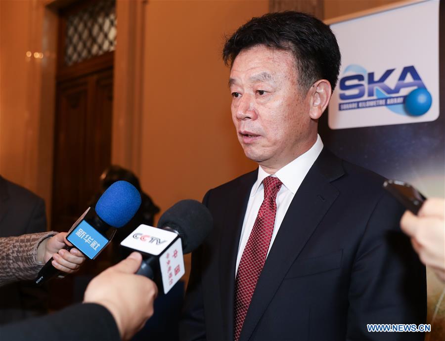 Chinese Vice Minister of Science and Technology Zhang Jianguo speaks to the media after signing the agreement to set up the body called Square Kilometre Array Observatory (SKA Observatory) in Rome, Italy, on March 12, 2019. An international treaty for the establishment of an intergovernmental organization overseeing the delivery of the world's largest radio telescope was signed here Tuesday. (Xinhua/Cheng Tingting)