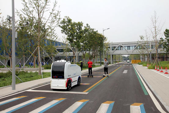 Photo taken on September 14, 2018 shows an unmanned logistic vehicle under test on a road around the citizen service center of Xiongan New Area, north China’s Hebei province. (Photo from People’s Daily Online)