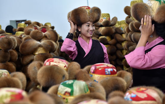 Two Tibetan women try hats at a hat factory in Dranang county, Shannan, Oct. 9, 2018. The factory, established in 2013, employs 45 local villagers from impoverished households and surplus rural laborers. The workers earn more than 6,500 yuan on average per month. As the products of the factory are well-received by the market, this year, the factory plans to recruit more people, which means more job opportunities for impoverished farmers and herders. (Photo by Xinhua News Agency)?