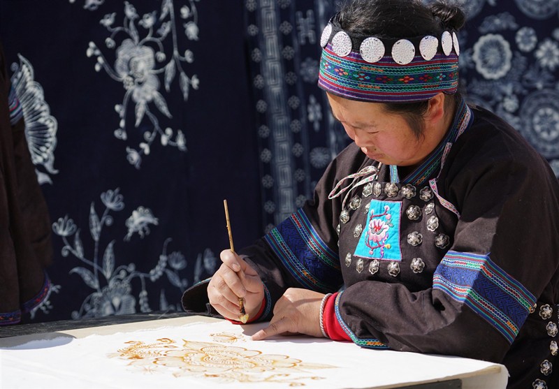 On November 28, 2018, in Yarong community, Baijin Town of Huishui County, Guizhou Province, Zhao Weiying, the inheritor of the maple scented dyeing technique, was painting the maple scented works.(Photo by People’s Daily Online)