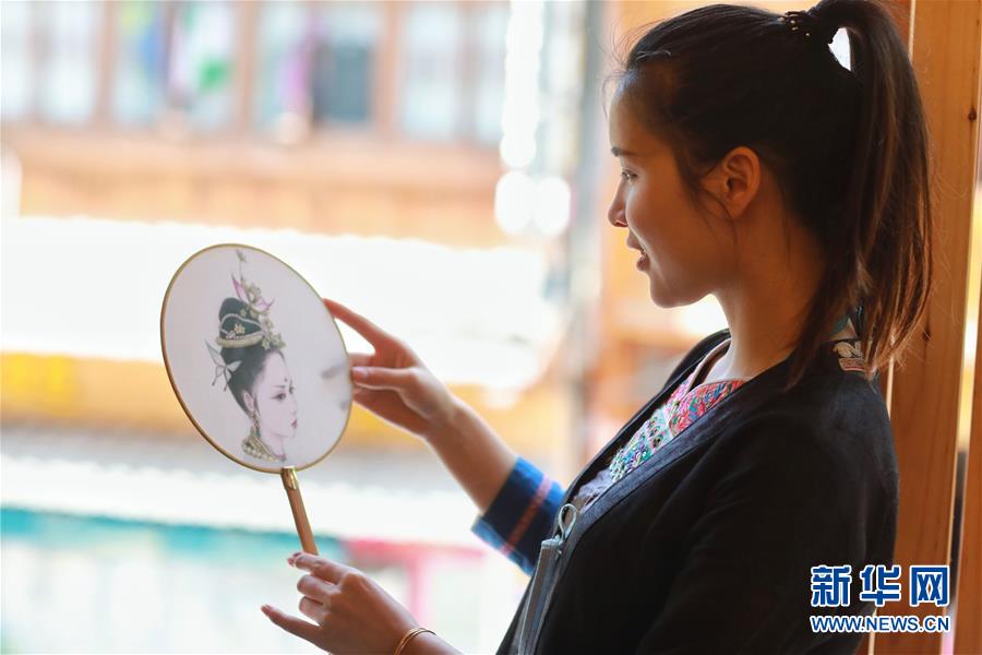 A Dong girl admires a fan printed with an illustration in Lan Caisheng's studio, April 14. (Photo/Xinhua)