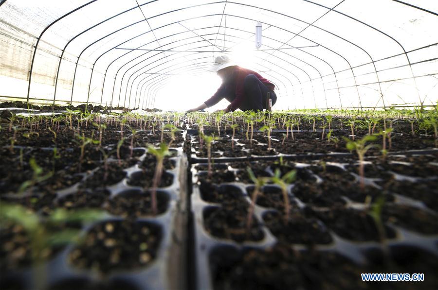 A farmer works in a greenhouse at Fengshan Township in Dafang County in Bijie City, southwest China's Guizhou Province, April 16, 2019. (Xinhua/Luo Dafu)