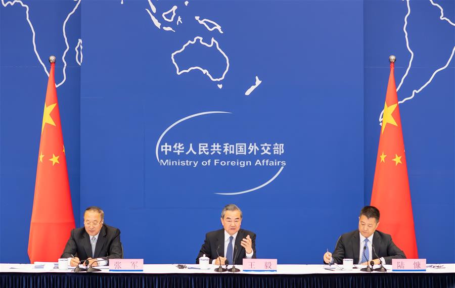 Chinese State Councilor and Foreign Minister Wang Yi (C) speaks during a press briefing for the second Belt and Road Forum for International Cooperation (BRF) in Beijing, capital of China, April 19, 2019. The second Belt and Road Forum for International Cooperation will be held from April 25 to 27 in Beijing, Wang Yi announced Friday. (Xinhua/Zhai Jianlan)