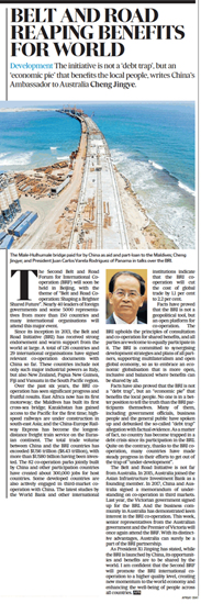 The Australian Financial Review published a signed article titled 'Belt and Road Reaping Benefits for World' by the Chinese Ambassador, introducing the Second Belt and Road Forum for International Cooperation which will soon be held in Beijing, China.