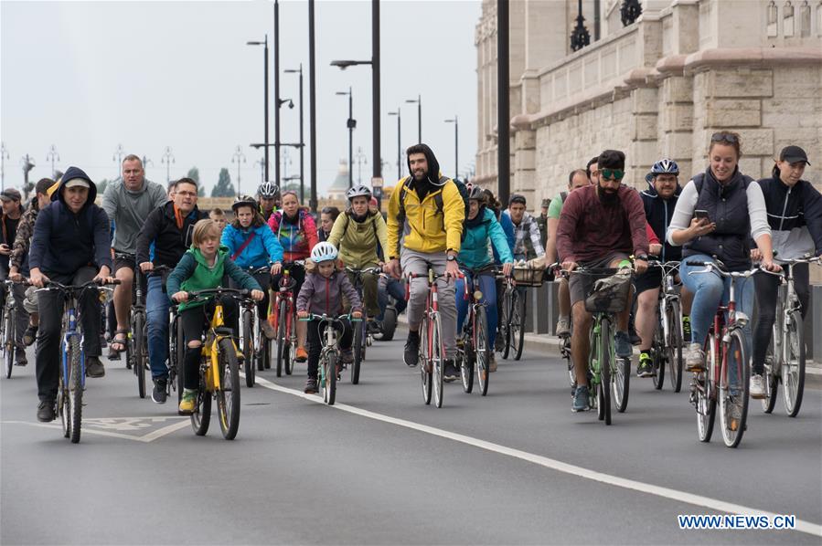 People participate in the "I Bike Budapest" event to promote bicycle as everyday transport in Budapest, Hungary, April 28, 2019. (Xinhua/Attila Volgyi)