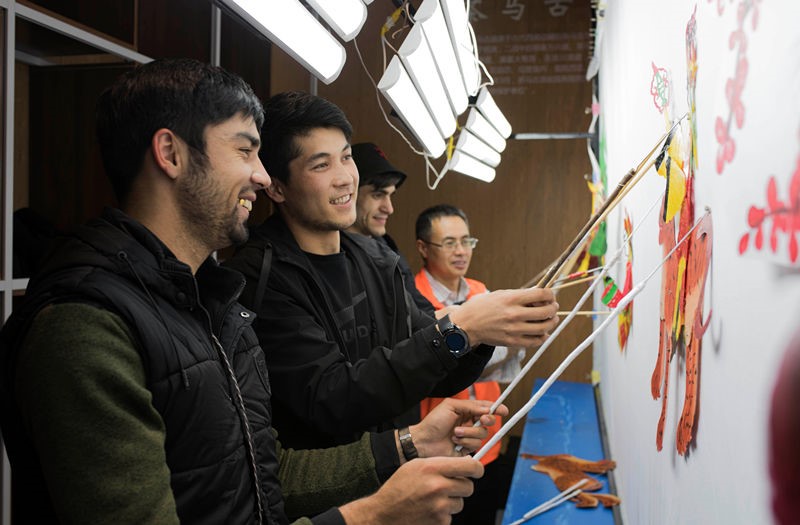 Two international students from the International Exchange College of Inner Mongolia Normal University make shadow puppets at the Inner Mongolia Exhibition Museum in Hohhot, capital of north China’s Inner Mongolia Autonomous Region, April 25, 2019. A total of 32 international students from Mongolia, Russia, Tajikistan, Laos, Cambodia, Pakistan and other countries participated in this cultural activity.