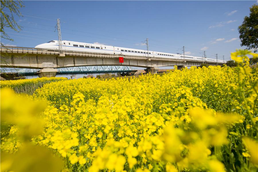 A high-speed train passes across Nantong city, Jiangsu province, on March 22, 2019. [Photo/Xinhua]