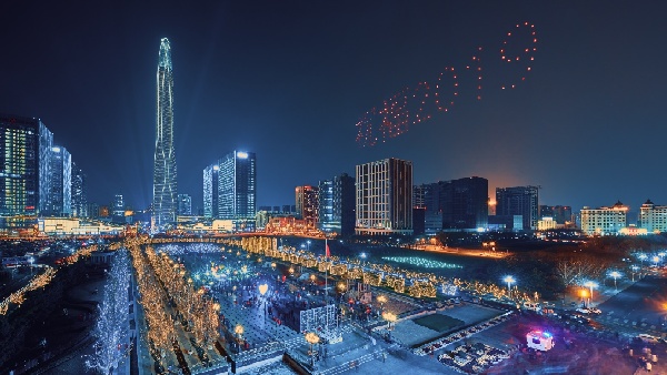 The aerial photo taken on Dec 31, 2018 shows the drone formation performance by Efy technology in Tianjin. (Photo/Xinhua)