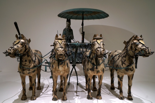 The exhibition features eight warrior figures and two life-size horses from the Imperial Army, as well as two half-size replica bronze chariots, each drawn by four horses.