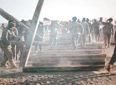 Workers build railways in the early stage of the center's development. (Photo/Jiuquan Satellite Launch Center)